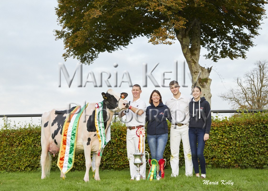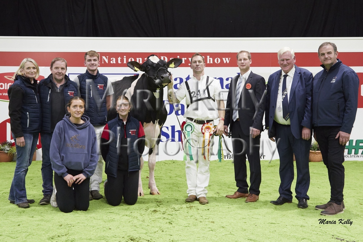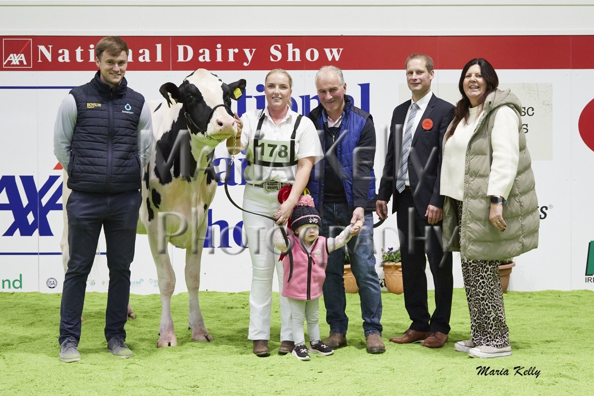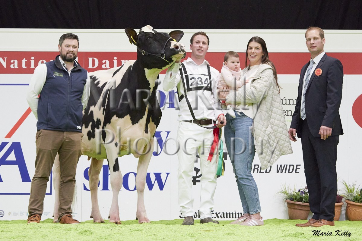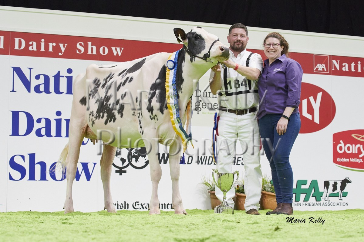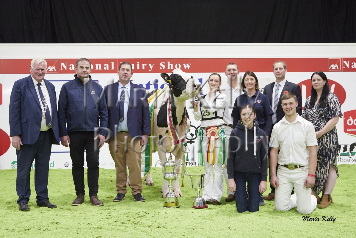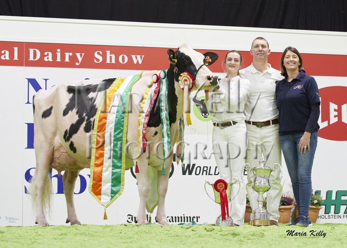 11/10/25 AXA National Dairy Show 2025, Irish Examiner Supreme Champion Hallow Octain Twizzle exhibited by Hallow Holsteins, Gorey, Co. Wexford, Philip & Linda Jones. Photo: Maria Kelly.