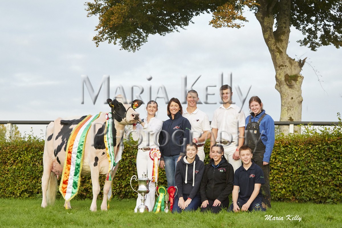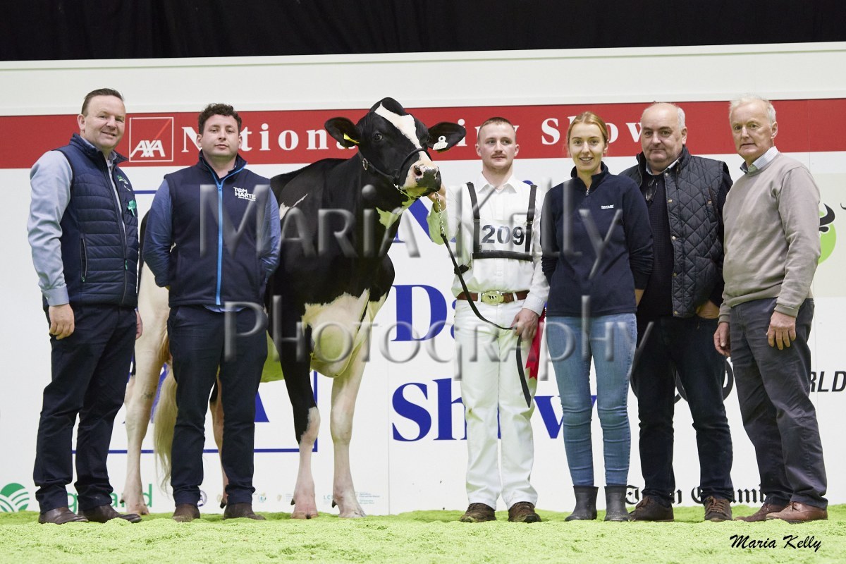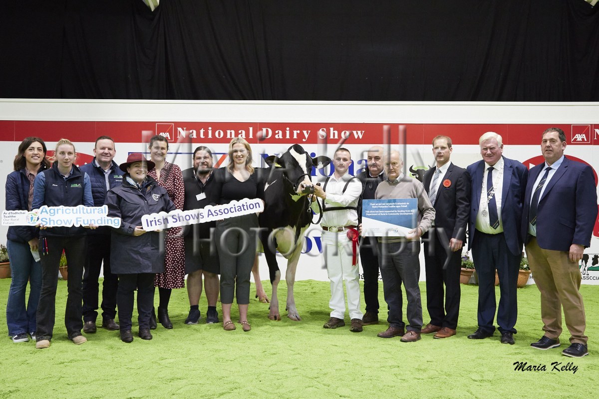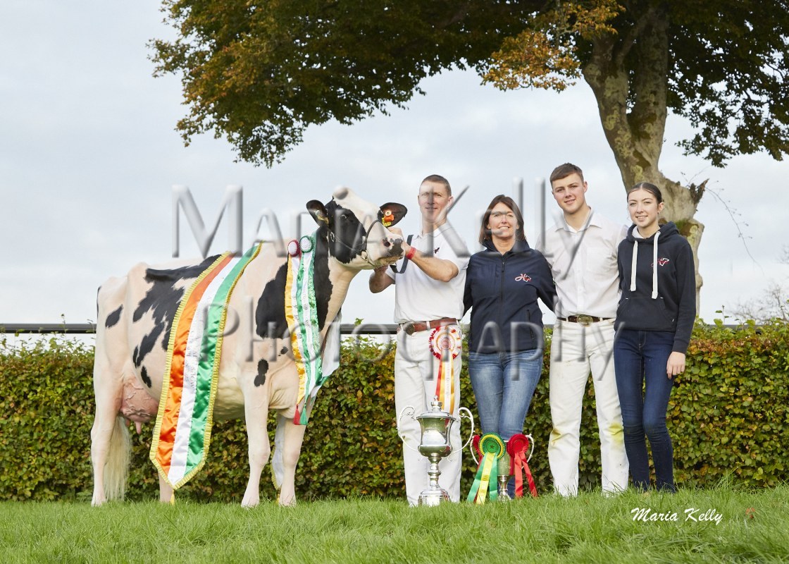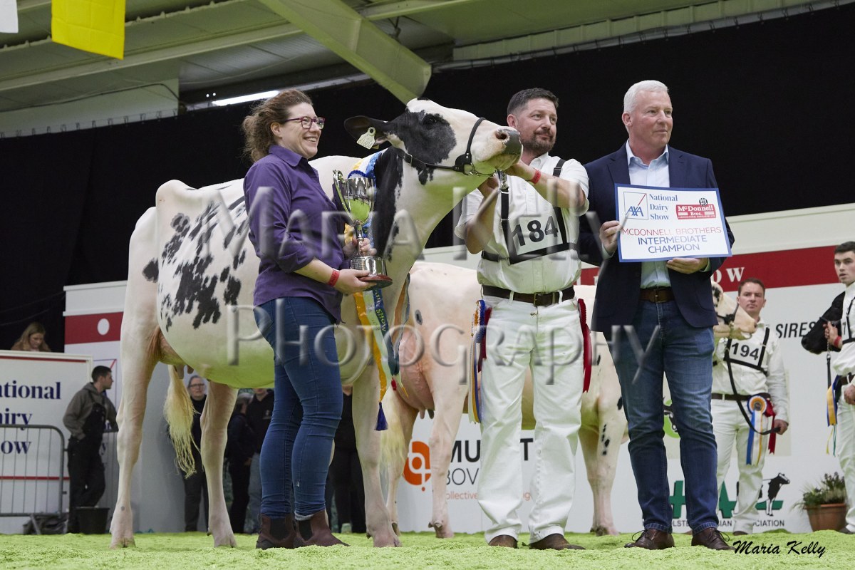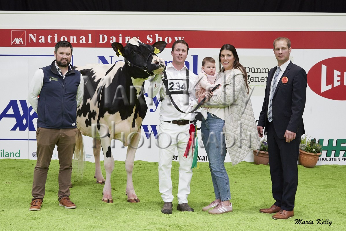 11/10/25 AXA National Dairy Show 2025, Irish Examiner Supreme Champion Hallow Octain Twizzle exhibited by Hallow Holsteins, Gorey, Co. Wexford, Philip & Linda Jones. Photo: Maria Kelly.
