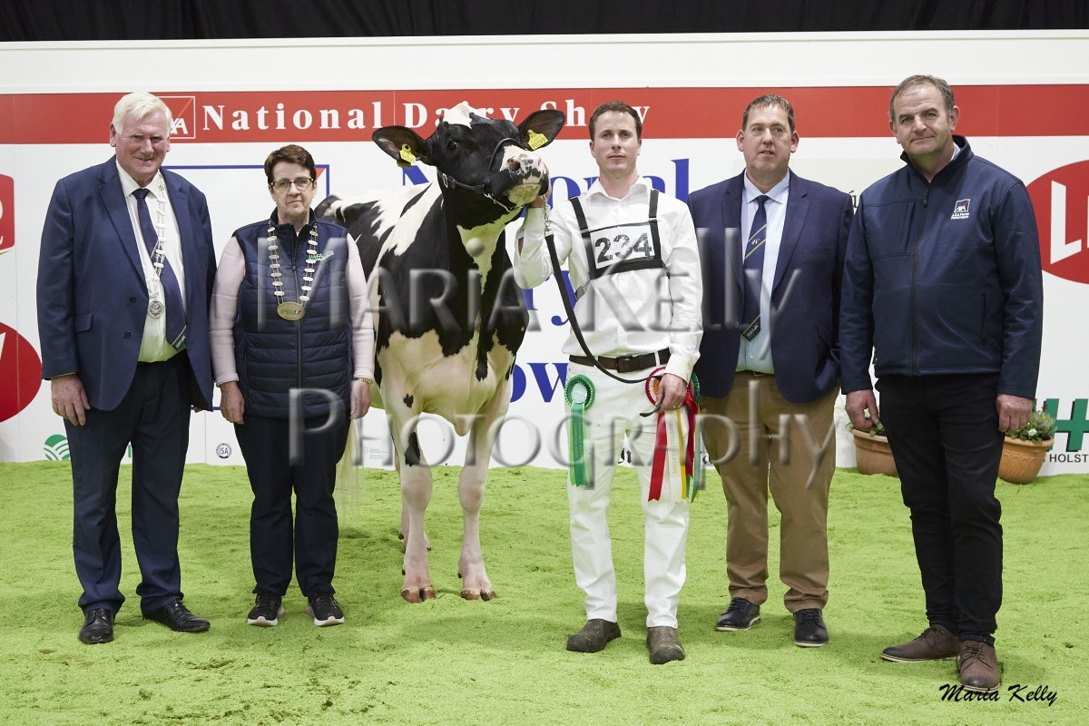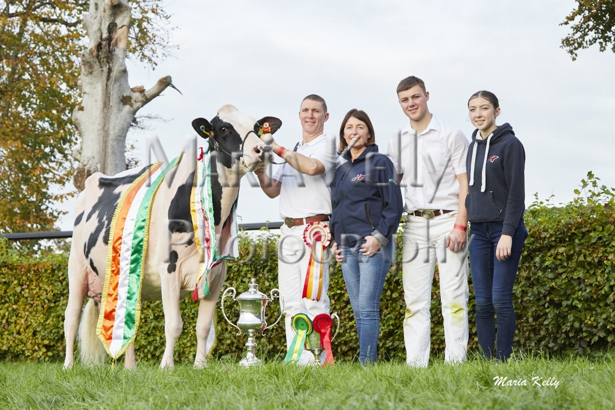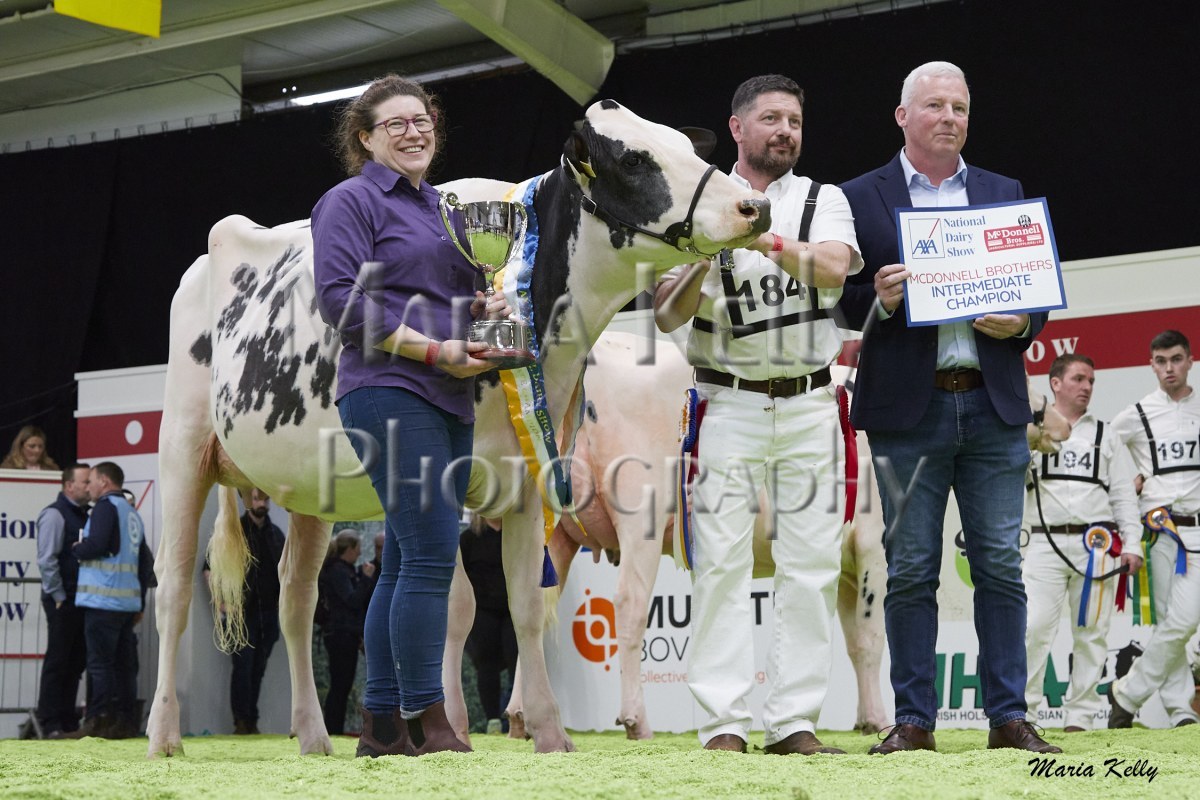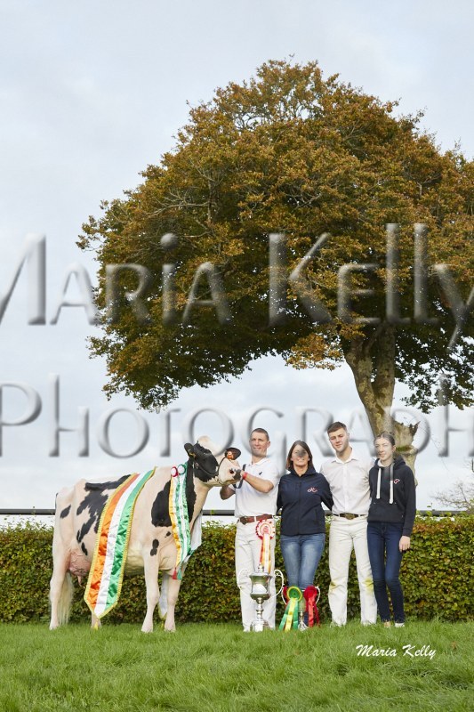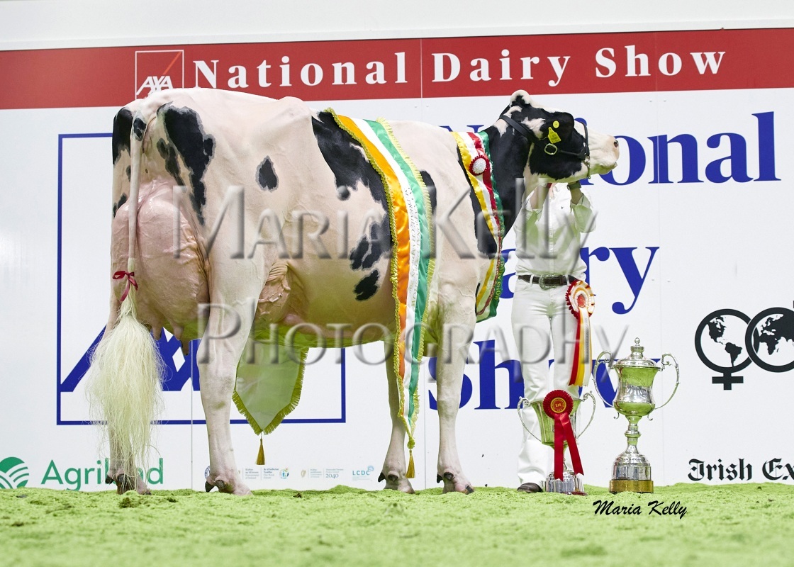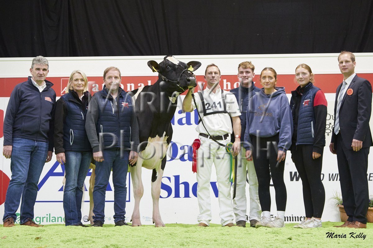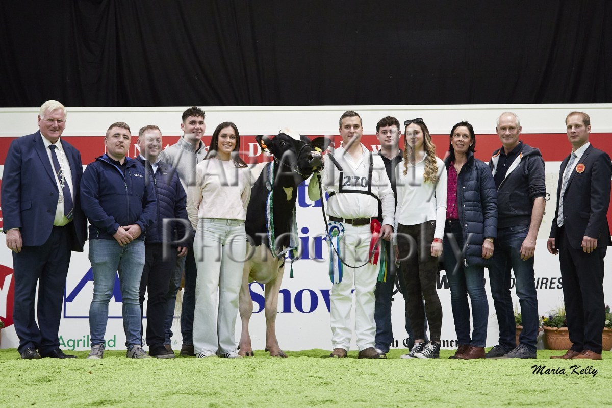 11/10/25 AXA National Dairy Show 2025, Irish Examiner Supreme Champion Hallow Octain Twizzle exhibited by Hallow Holsteins, Gorey, Co. Wexford, Philip & Linda Jones. Photo: Maria Kelly.