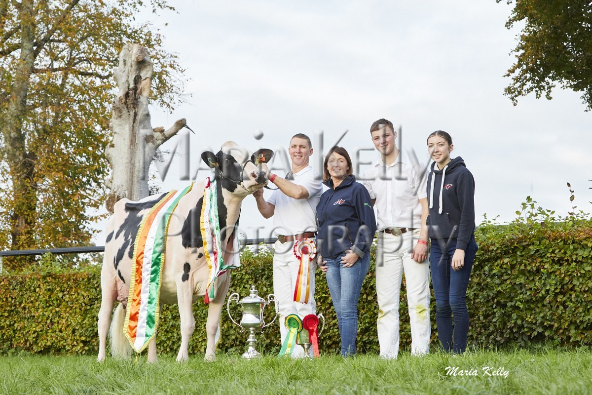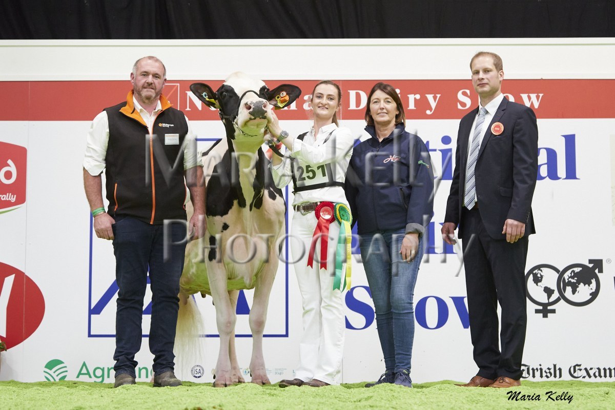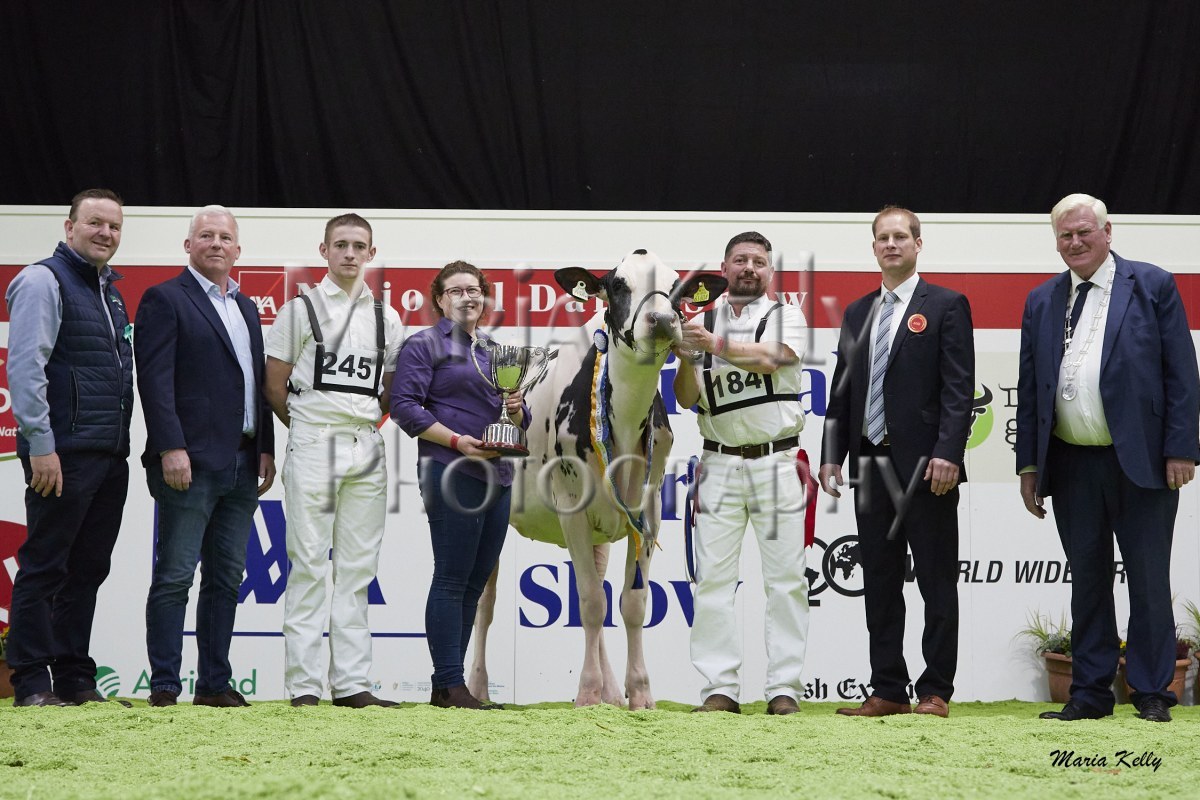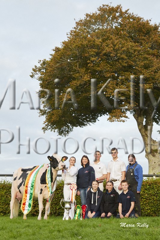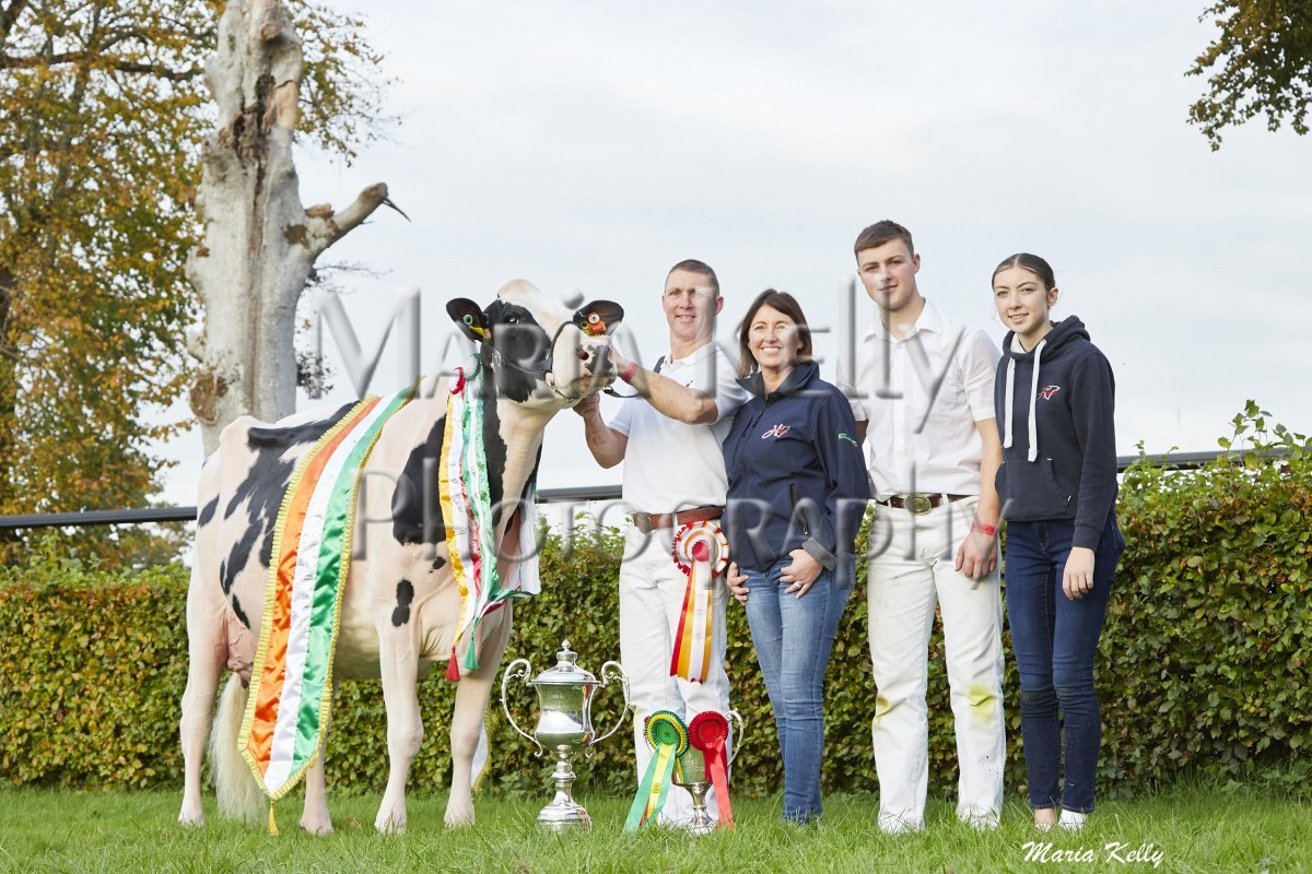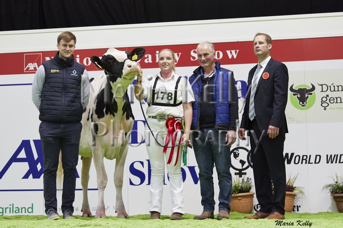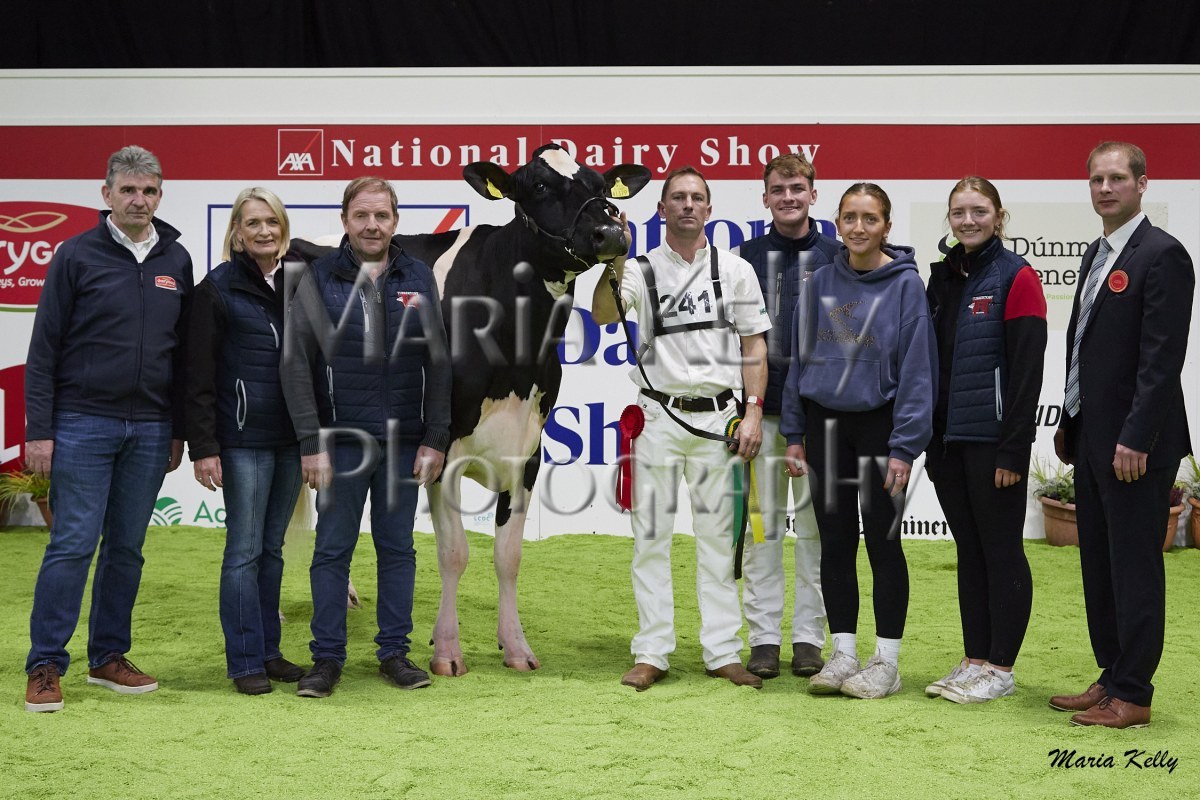 11/10/25 AXA National Dairy Show 2025, Irish Examiner Supreme Champion Hallow Octain Twizzle exhibited by Hallow Holsteins, Gorey, Co. Wexford, Philip & Linda Jones. Photo: Maria Kelly.