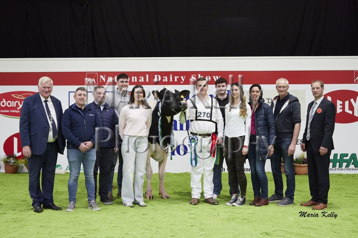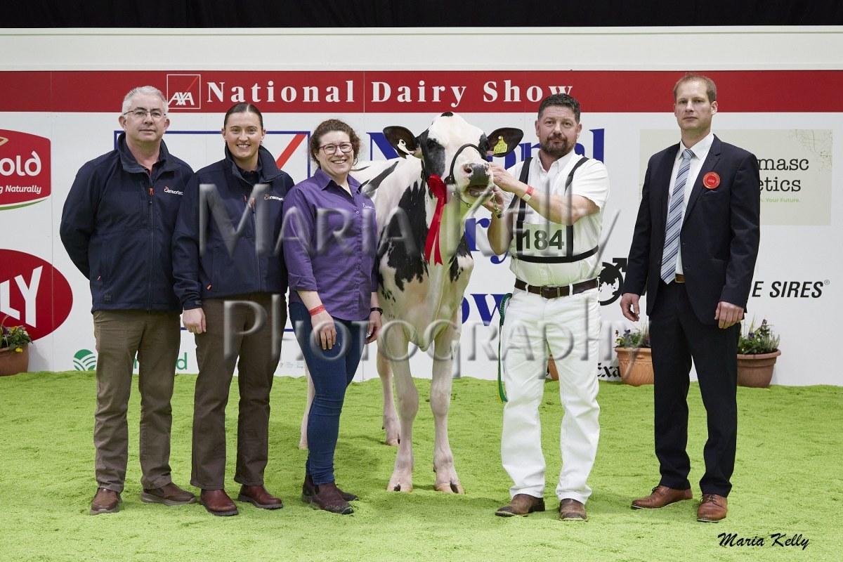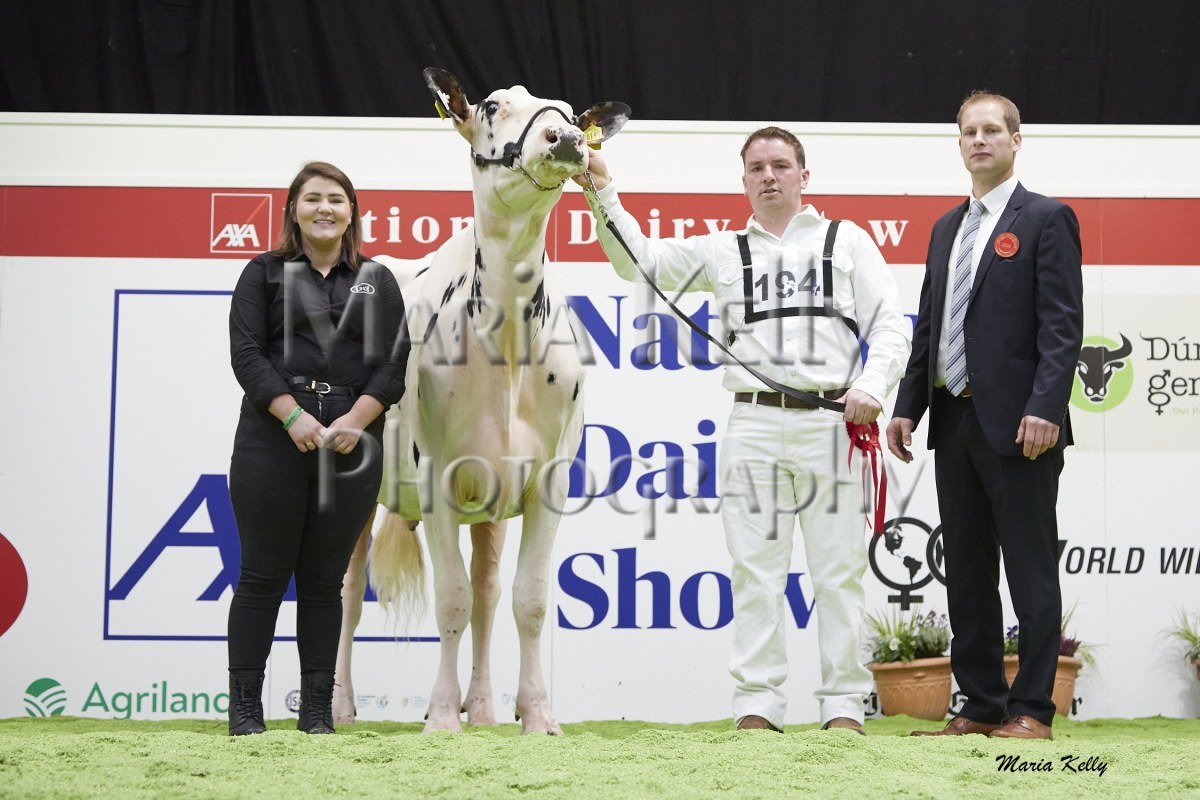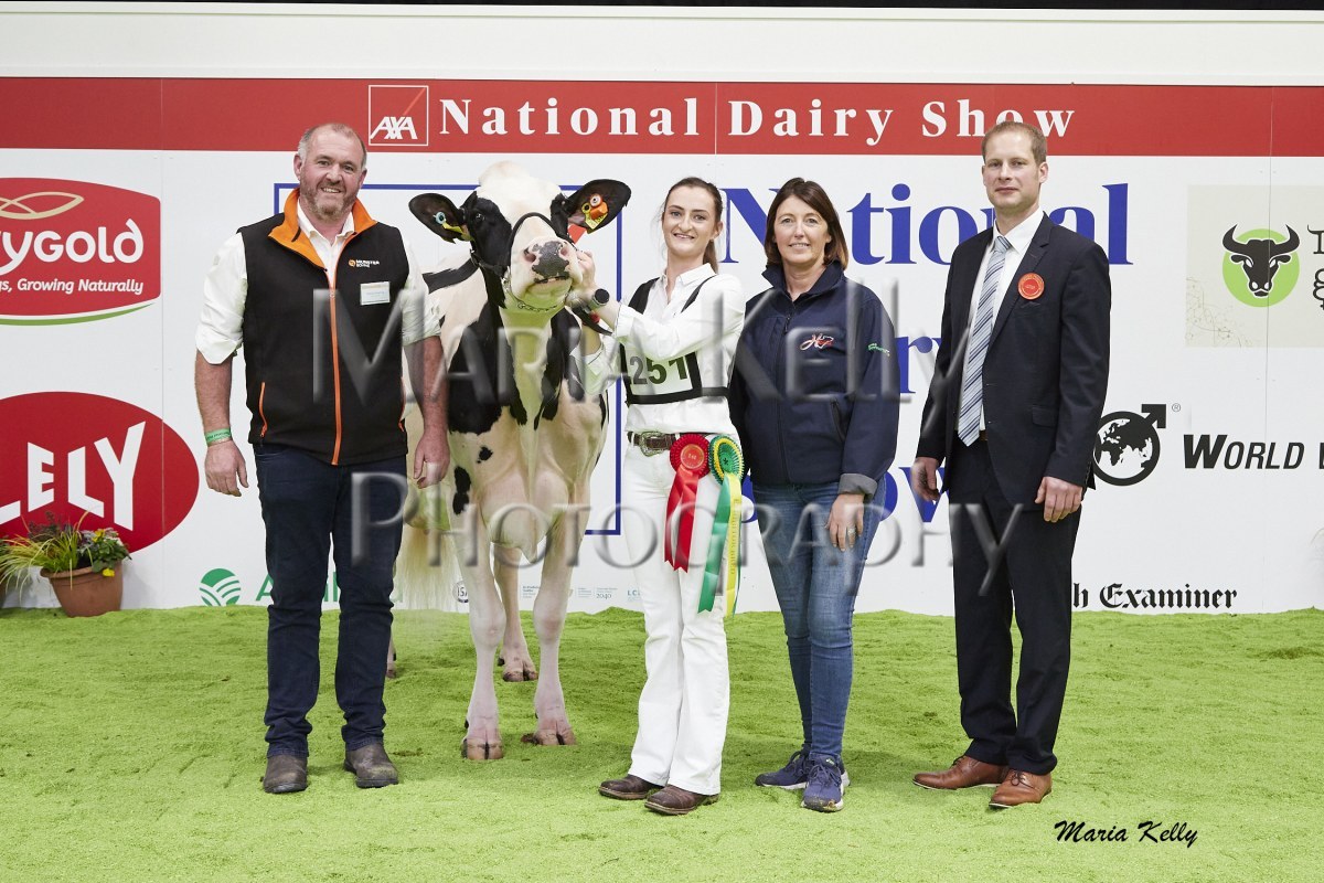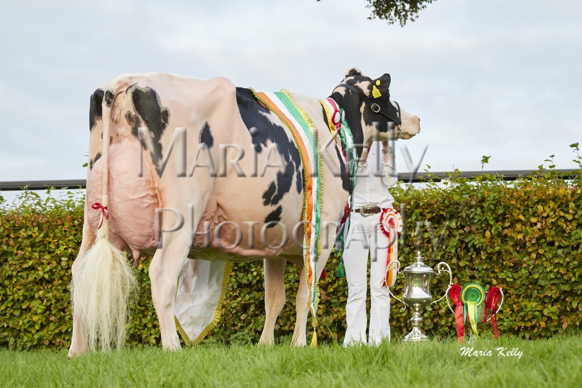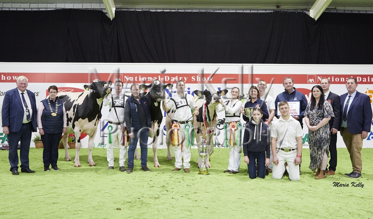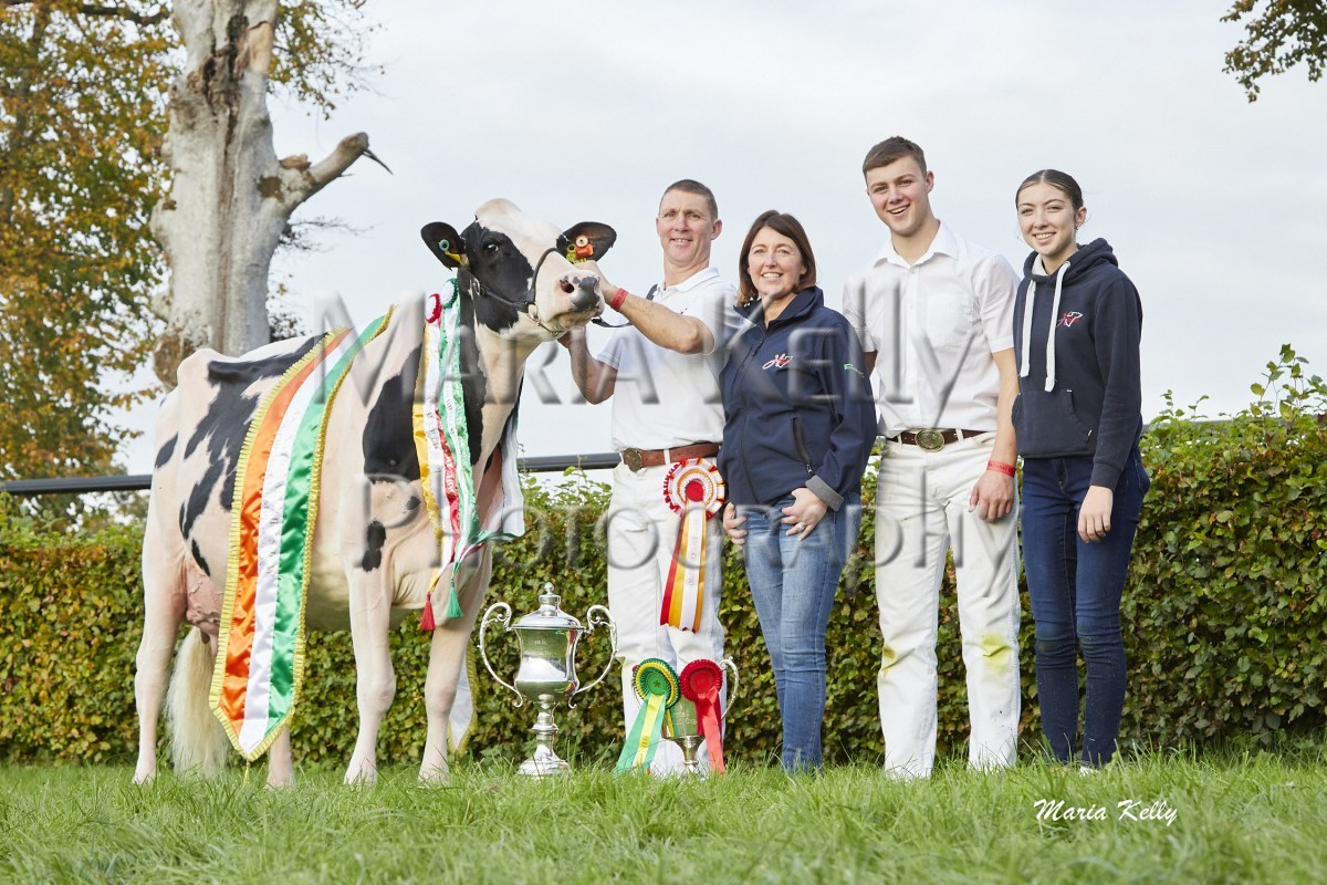 11/10/25 AXA National Dairy Show 2025, Irish Examiner Supreme Champion Hallow Octain Twizzle exhibited by Hallow Holsteins, Gorey, Co. Wexford, Philip & Linda Jones. Photo: Maria Kelly.