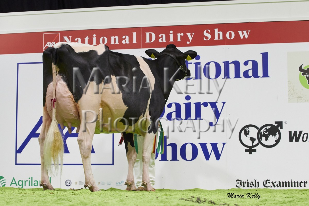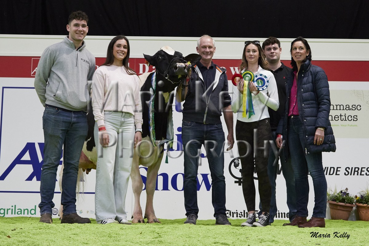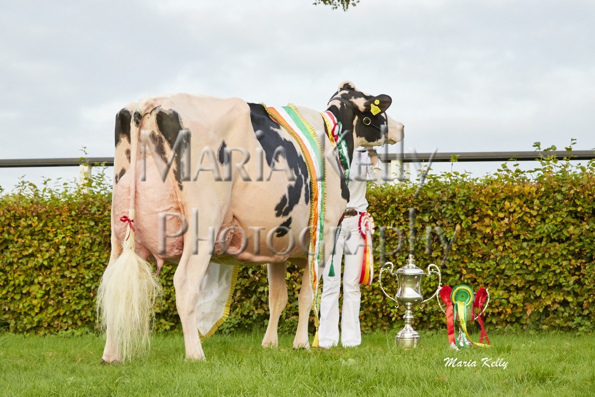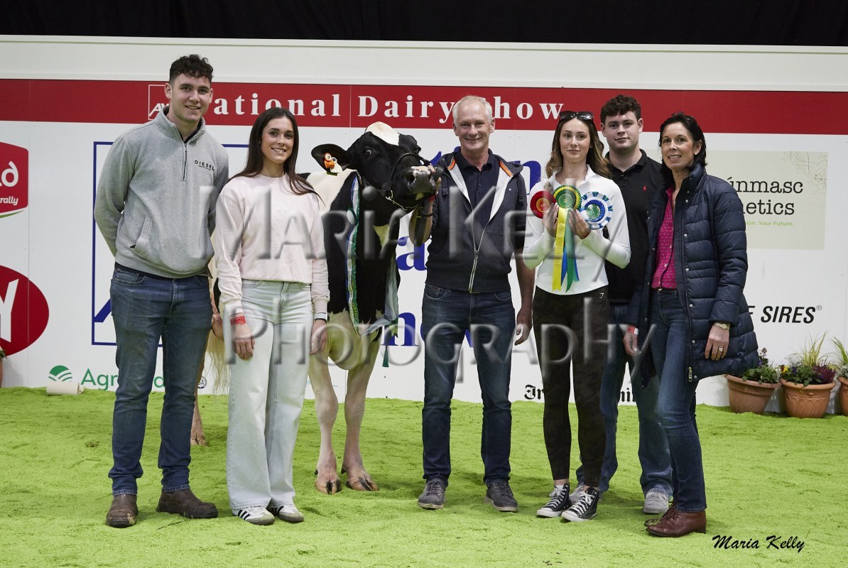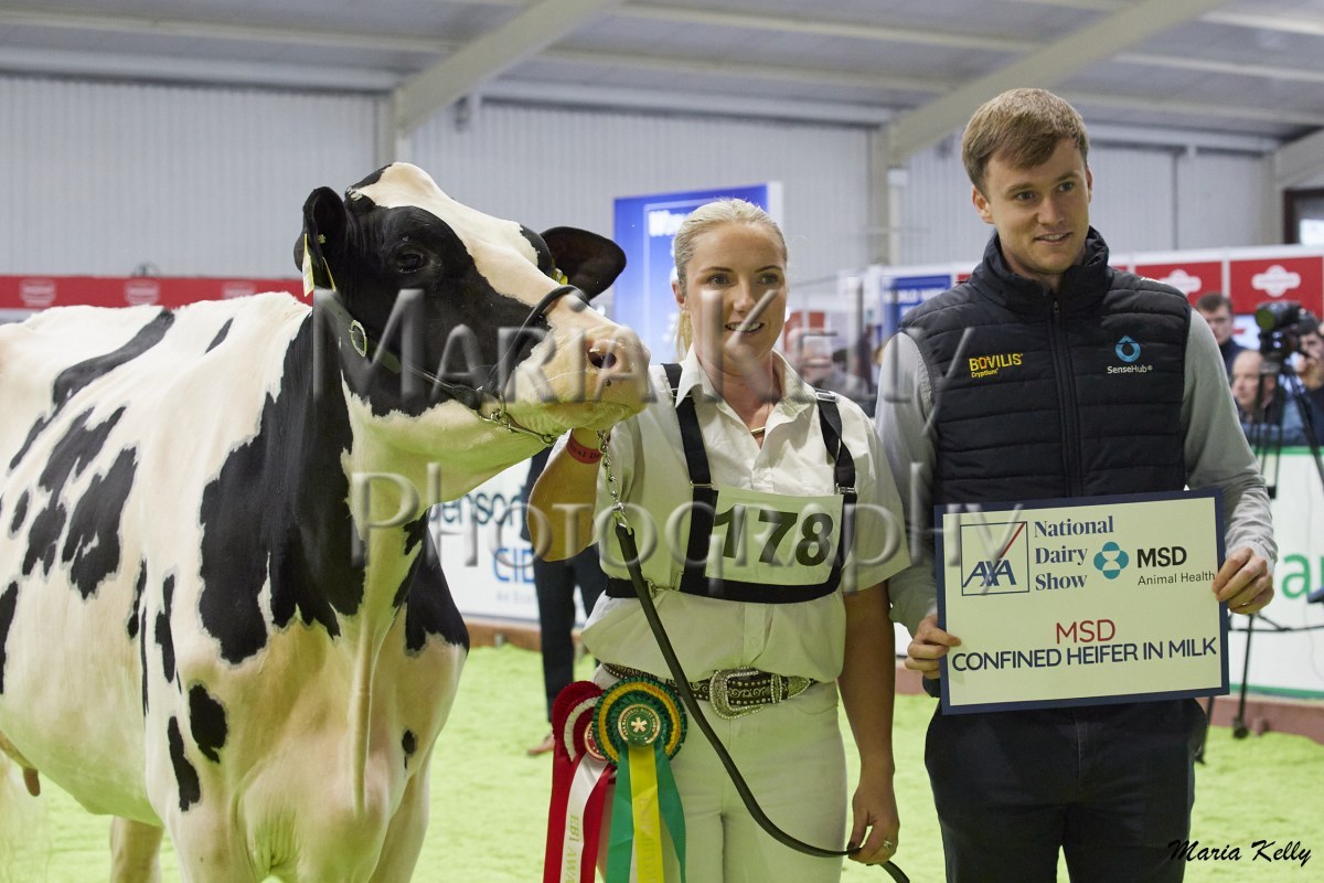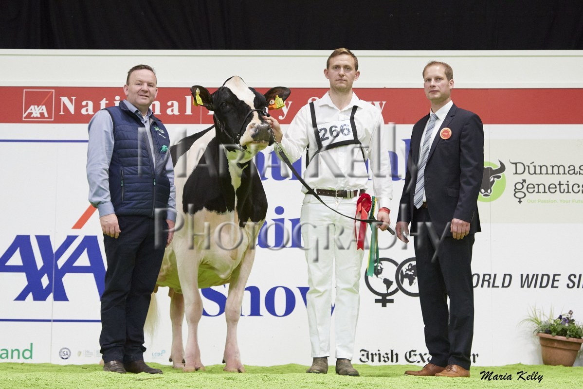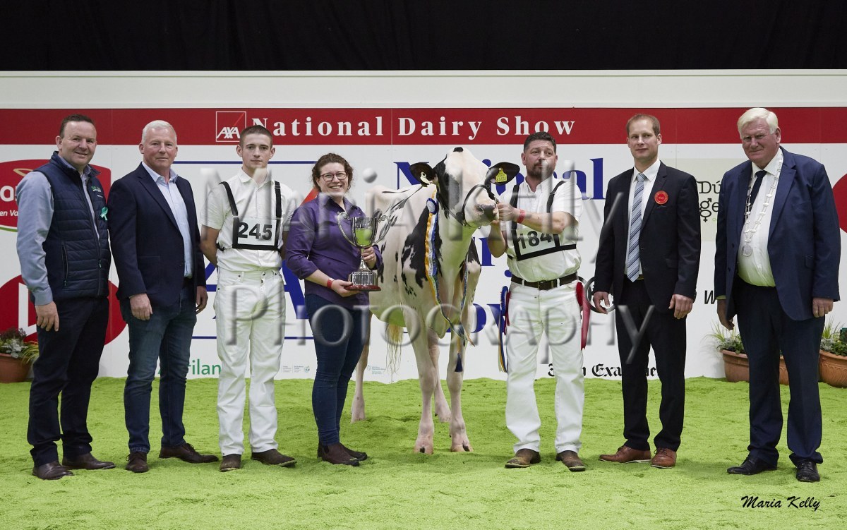 11/10/25 AXA National Dairy Show 2025, Irish Examiner Supreme Champion Hallow Octain Twizzle exhibited by Hallow Holsteins, Gorey, Co. Wexford, Philip & Linda Jones. Photo: Maria Kelly.