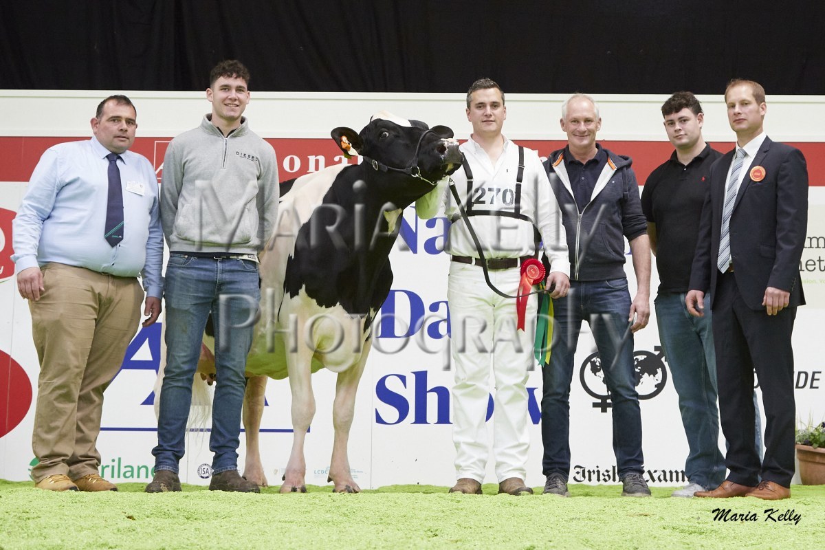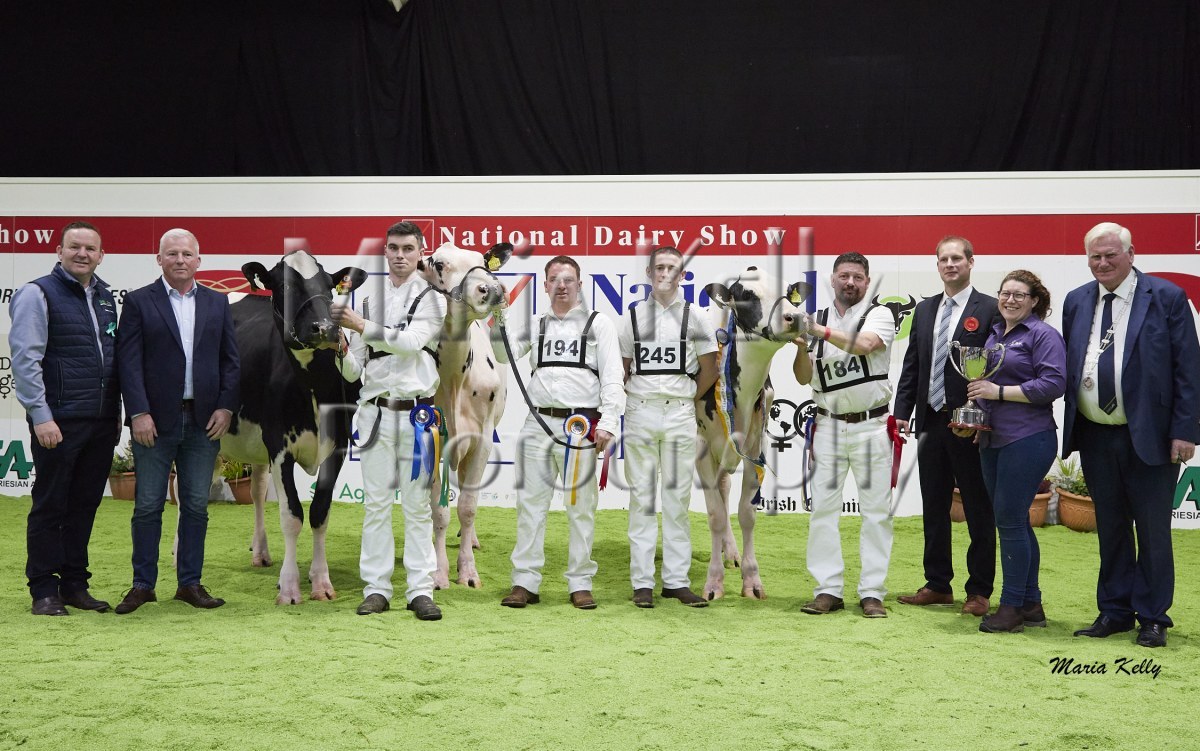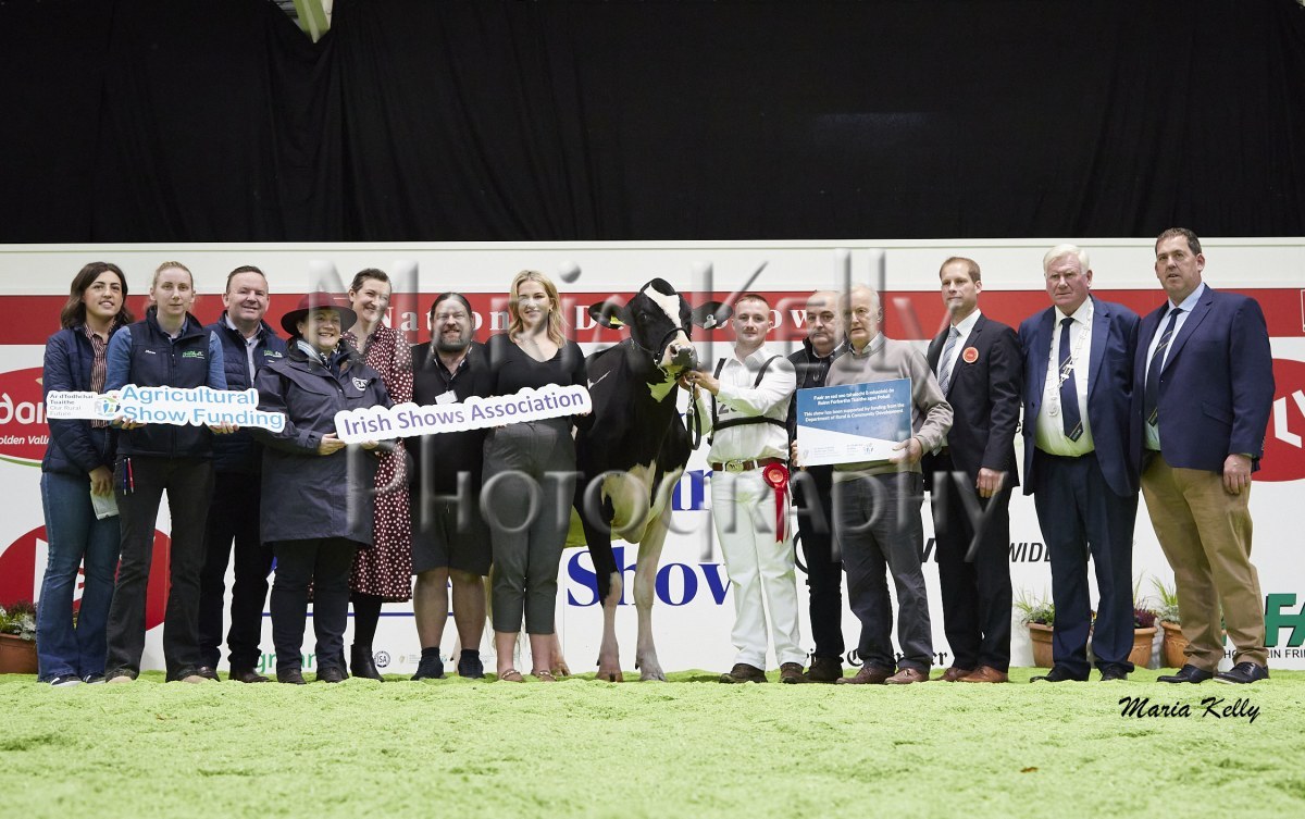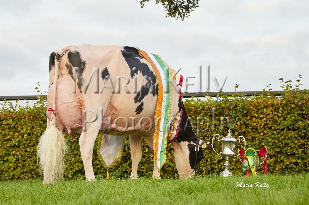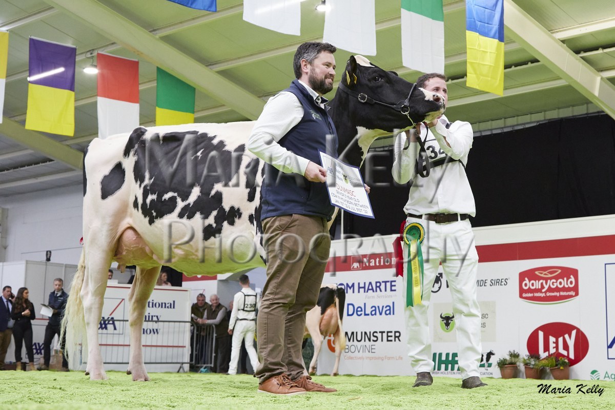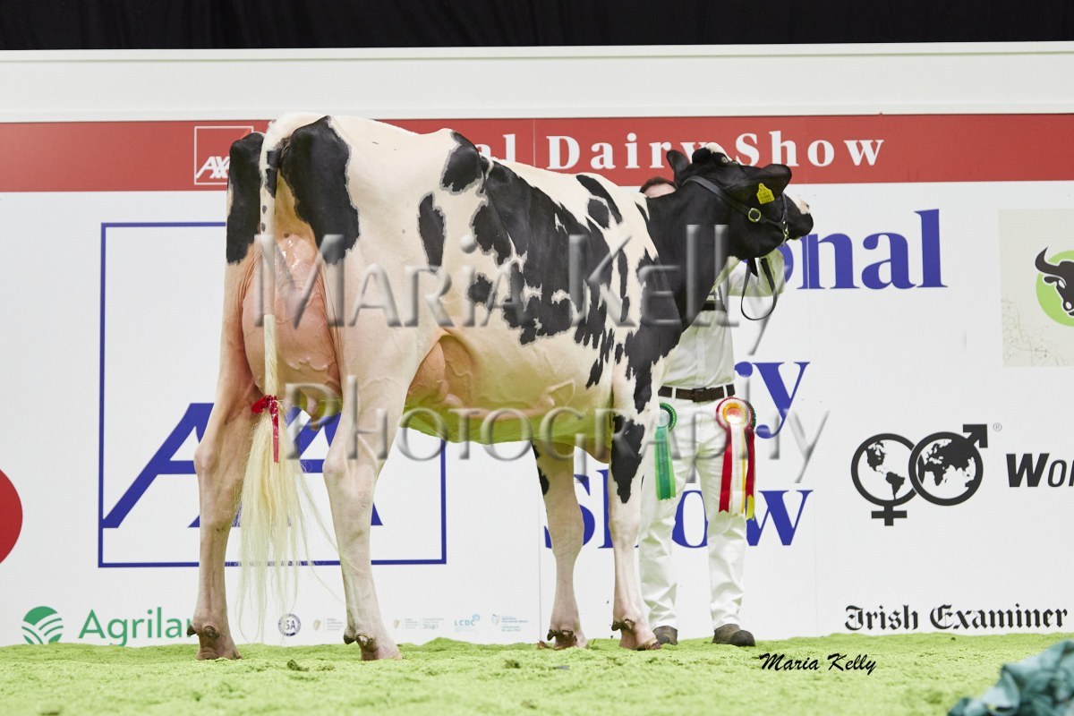 11/10/25 AXA National Dairy Show 2025, Irish Examiner Supreme Champion Hallow Octain Twizzle exhibited by Hallow Holsteins, Gorey, Co. Wexford, Philip & Linda Jones. Photo: Maria Kelly.