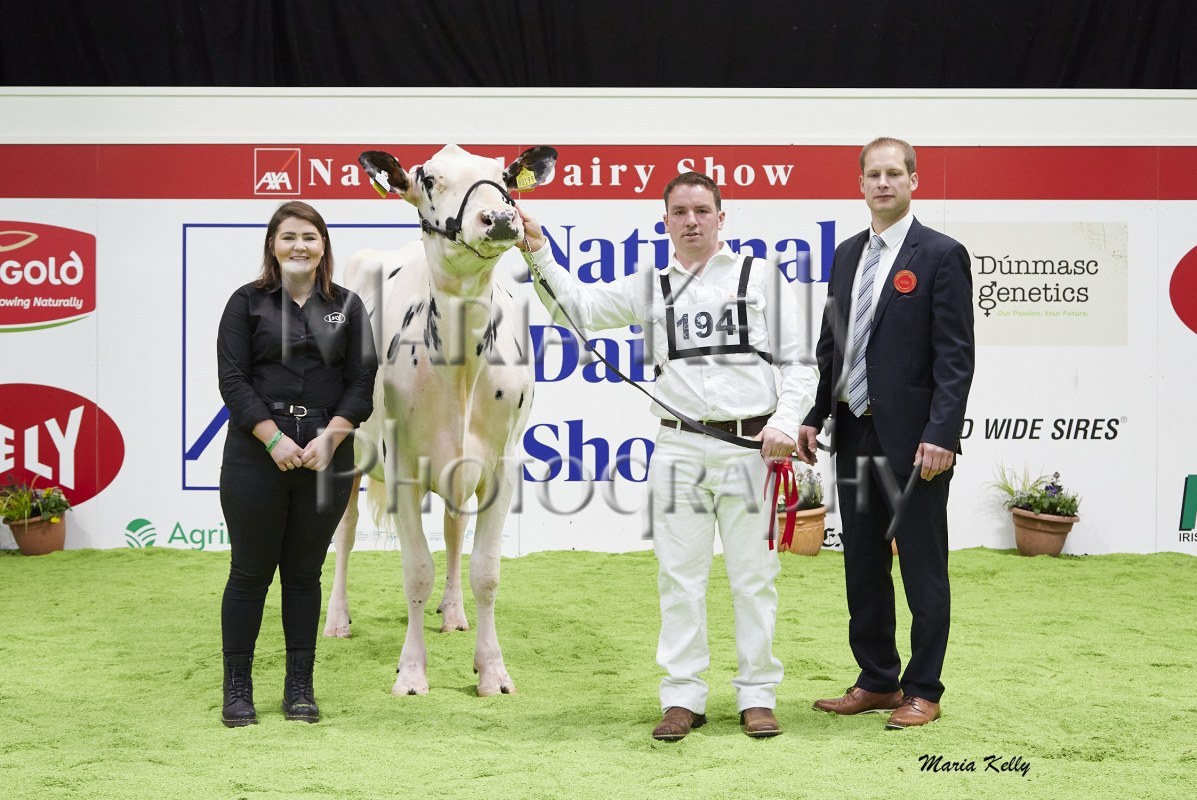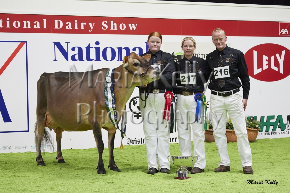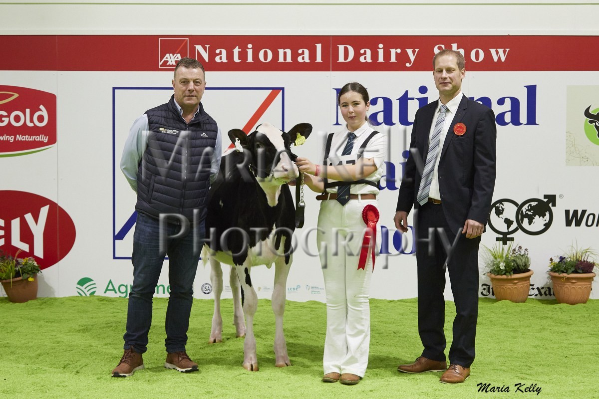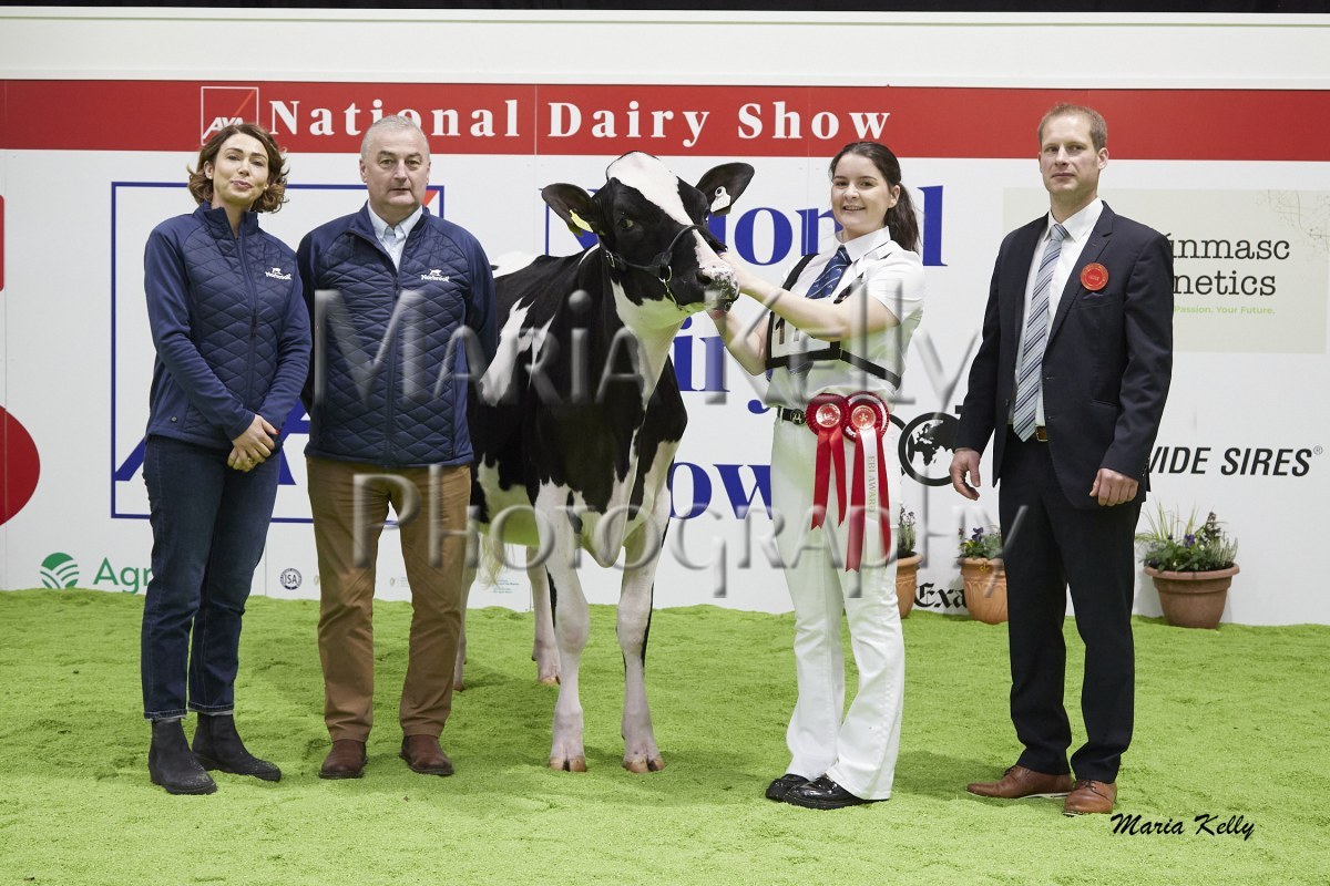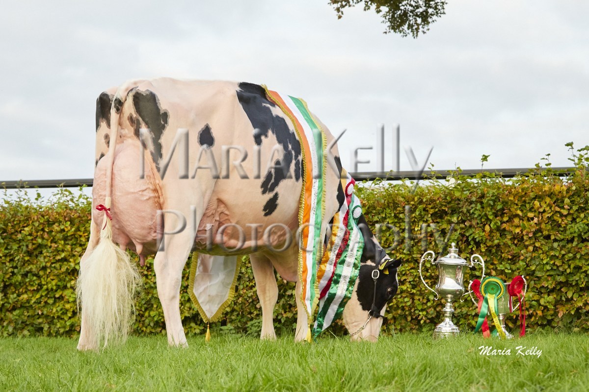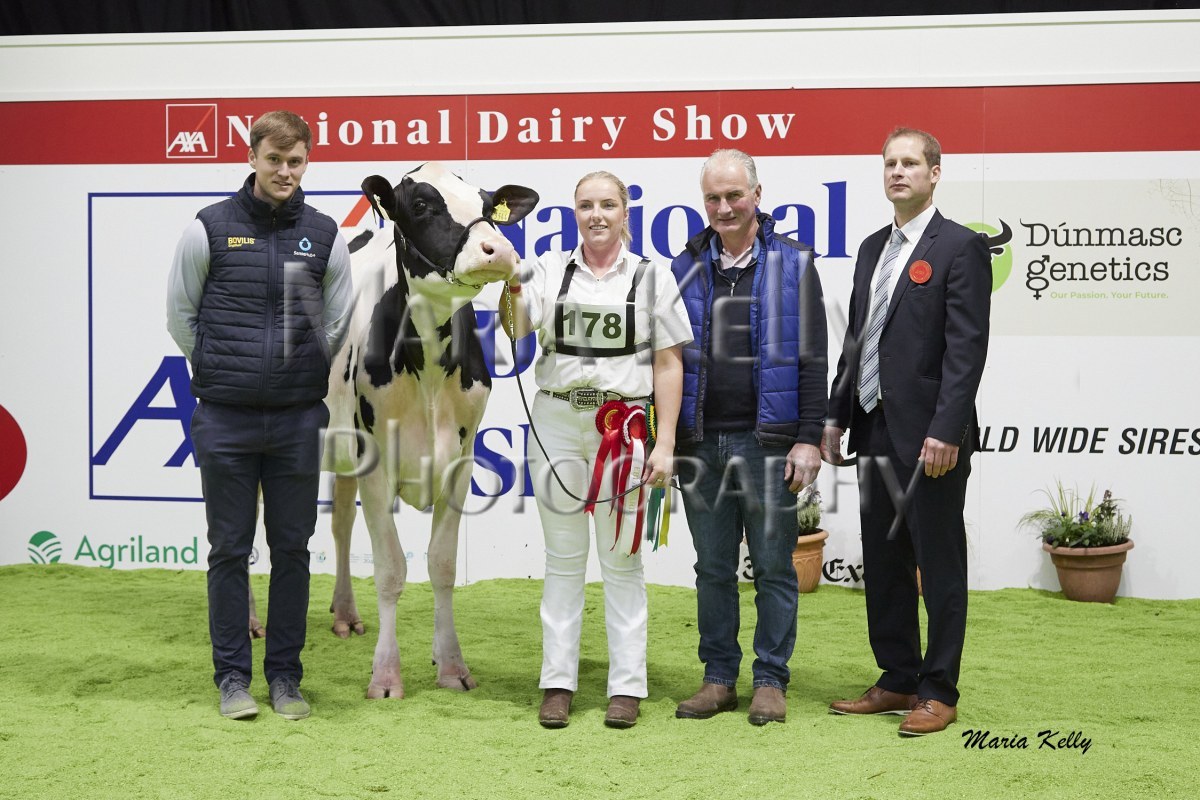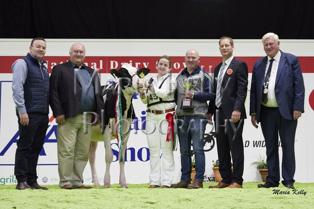 11/10/25 AXA National Dairy Show 2025, Irish Examiner Supreme Champion Hallow Octain Twizzle exhibited by Hallow Holsteins, Gorey, Co. Wexford, Philip & Linda Jones. Photo: Maria Kelly.