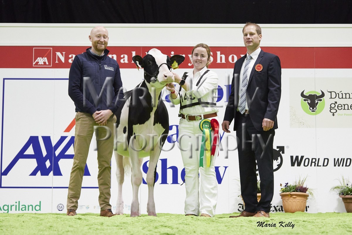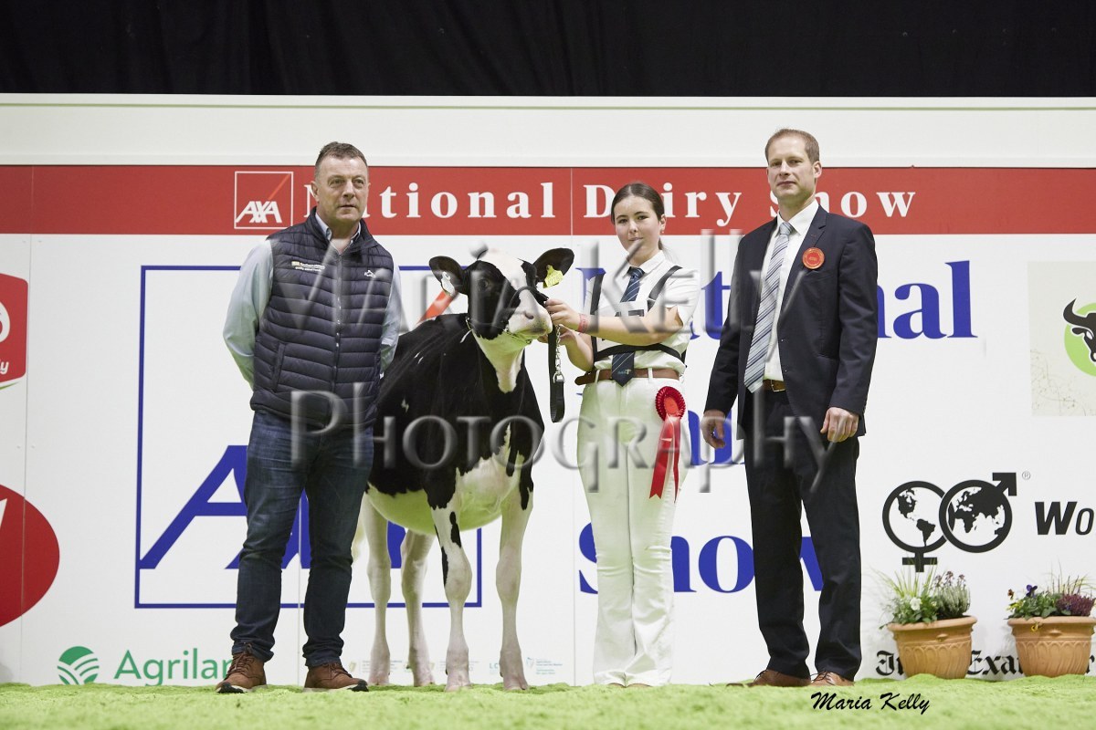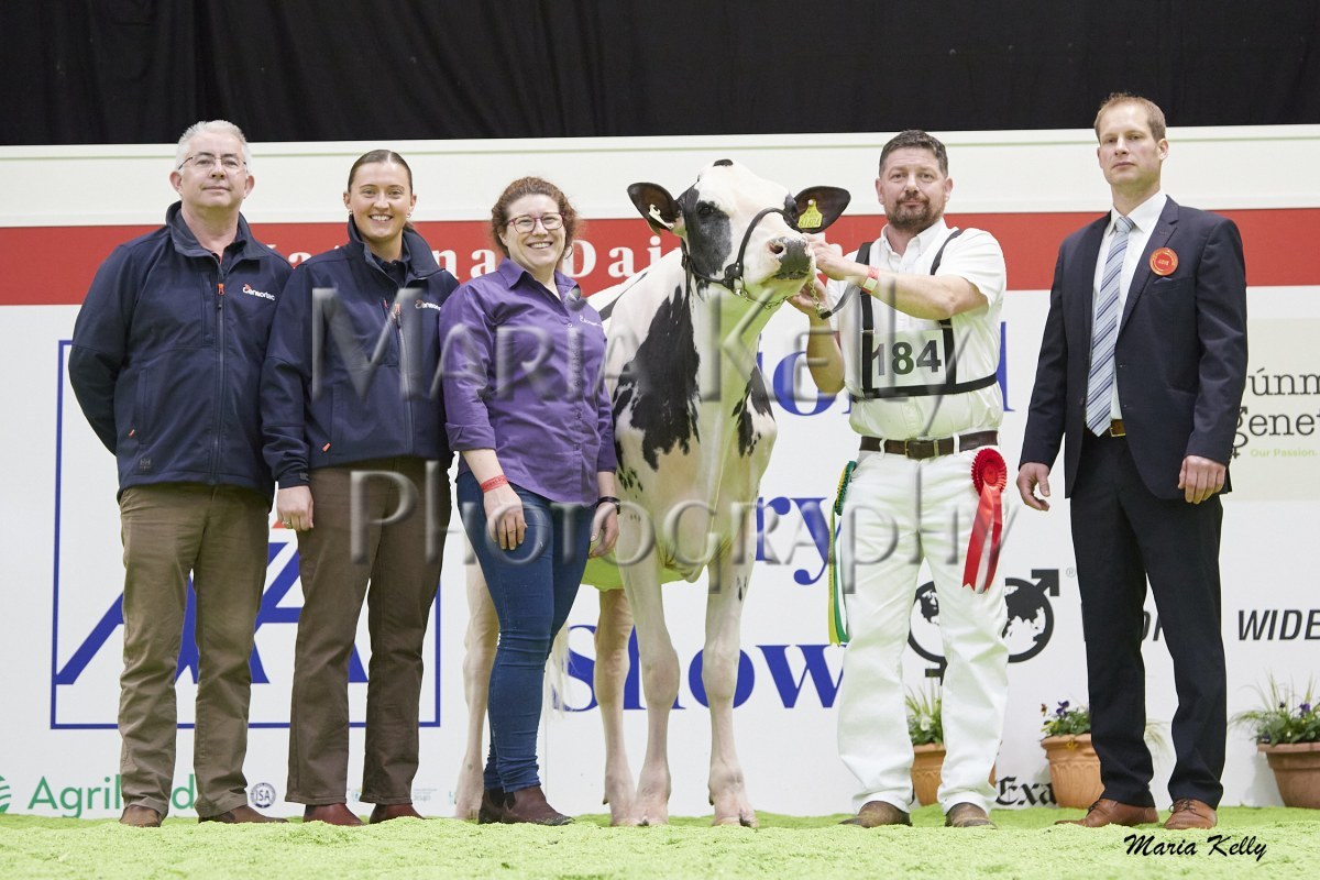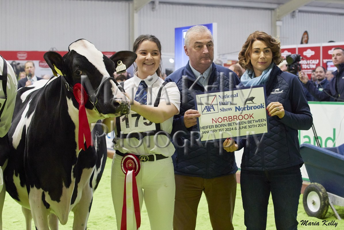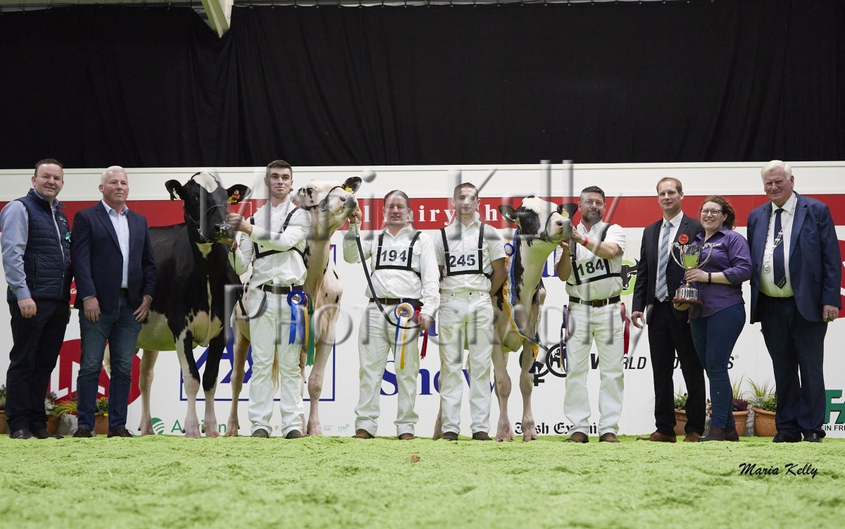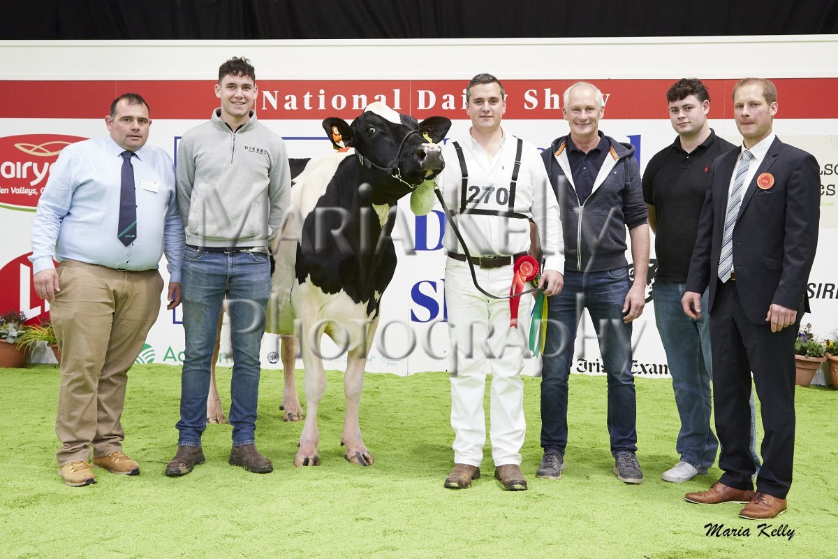 11/10/25 AXA National Dairy Show 2025, Irish Examiner Supreme Champion Hallow Octain Twizzle exhibited by Hallow Holsteins, Gorey, Co. Wexford, Philip & Linda Jones. Photo: Maria Kelly.